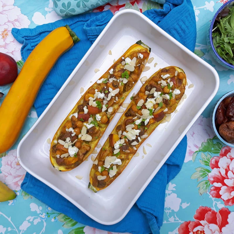 Dit was zó lekker! Deze gele courgettes vulde ik met een mengsel van dadels, vijgen, perzik, banaan, kikkererwten, rozijnen & kerriesaus. Samen met een handje amandelschaafsel en geitenkaas smaakte dat zo ontzettend goed!
