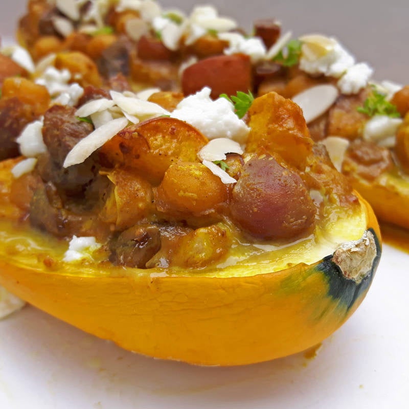 - Roer de perzik, kikkererwten, rozijnen, banaan, dadels en vijgen door de kerriesaus. Verdeel dit mengsel over de twee halve courgettes.