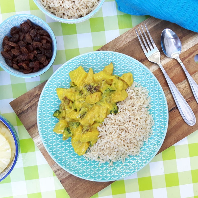 - Serveer de rijst met de kip kerrie. Lekker met wat koude ananas en kroepoek er bij.