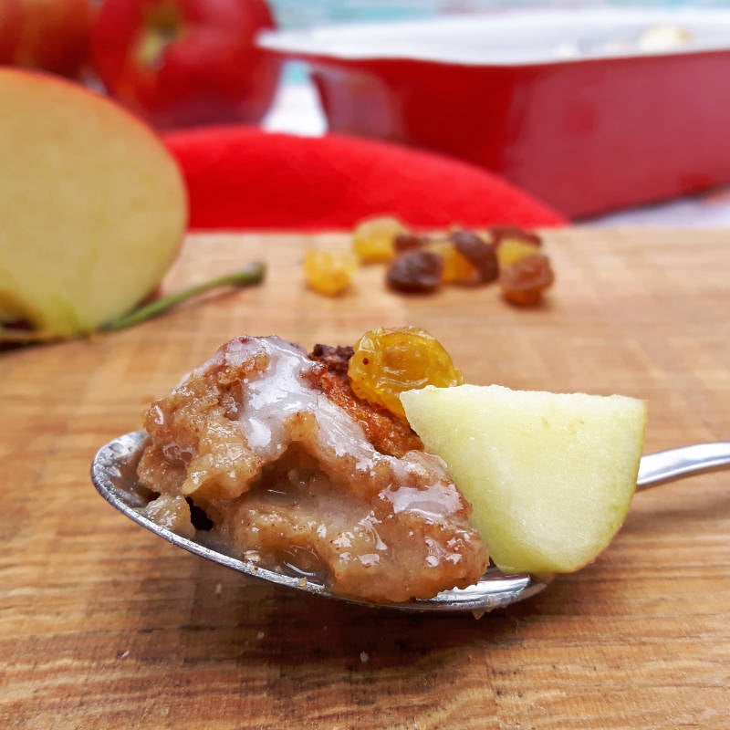 En die chaos is helemaal niet erg, want je eet 't toch allemaal op. Want dit is lekker! Het proeft naar warme appeltaart, maar dan met brood. Een beetje knapperig aan de bovenkant en zacht van binnen. Een bolletje vanille-ijs is er vast ook erg lekker bij!