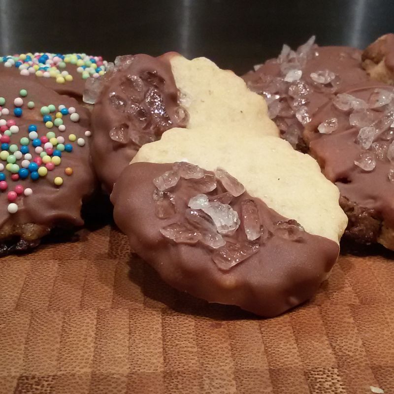 Lekker harde, knapperige koekjes met een dikke laag chocolade! Daar houden wij hier wel van. Deze suikerkoekjes voldoen helemaal aan die eisen!