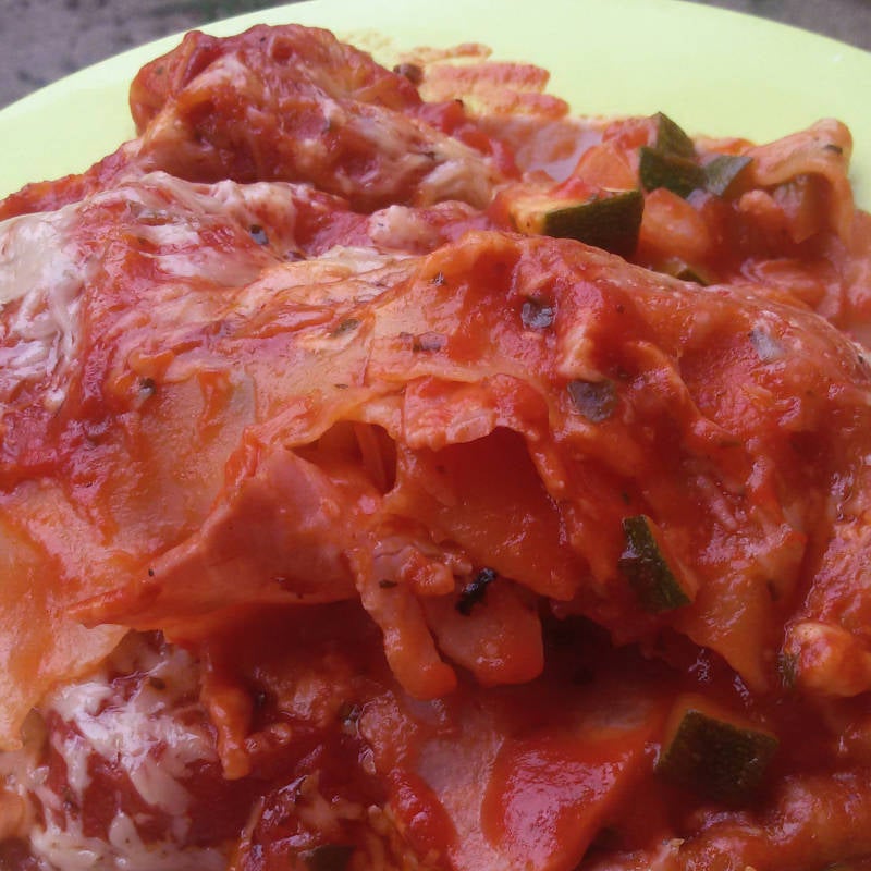 Ik maakte deze lasagne in een skottelbraai: met een deksel er op doet 'ie het prima als oventje. Ik gebruikte er alleen het verkeerde rooster onder, dus de onderste laag was een beetje aangebrand. De volgende keer maak ik 'm op het grillrooster; dat zou beter moeten gaan.