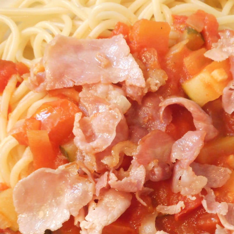 Geen gehakt of ham door de pasta, maar bacon! Samen met de zelfgemaakte tomatensaus geeft dat een lekker andere smaak aan deze spaghetti.