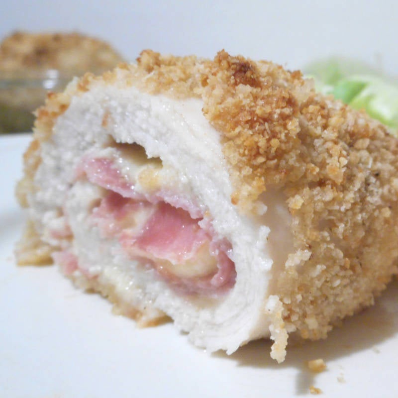 Zorg er wel voor dat je een goed scherp mes hebt, dat maakt het doormidden snijden van de kipfilet een stuk gemakkelijker. Even beleggen met ham en kaas, oprollen & door de ei en paneermeel met kaas. En daarna doet de oven het werk. Kan niet mislukken!