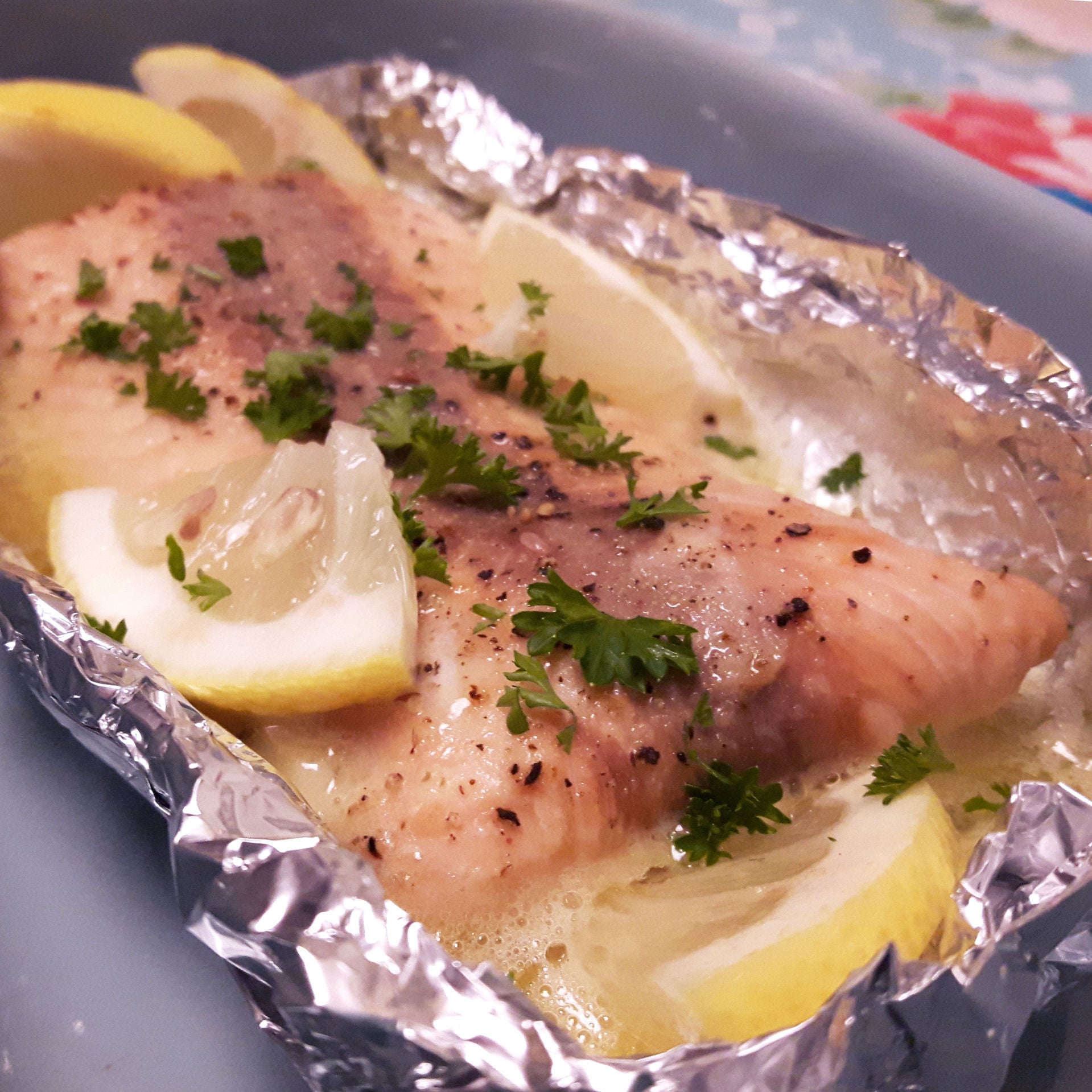 - Strooi er wat gesnipperde peterselie over heen en serveer met wat schijfjes citroen.