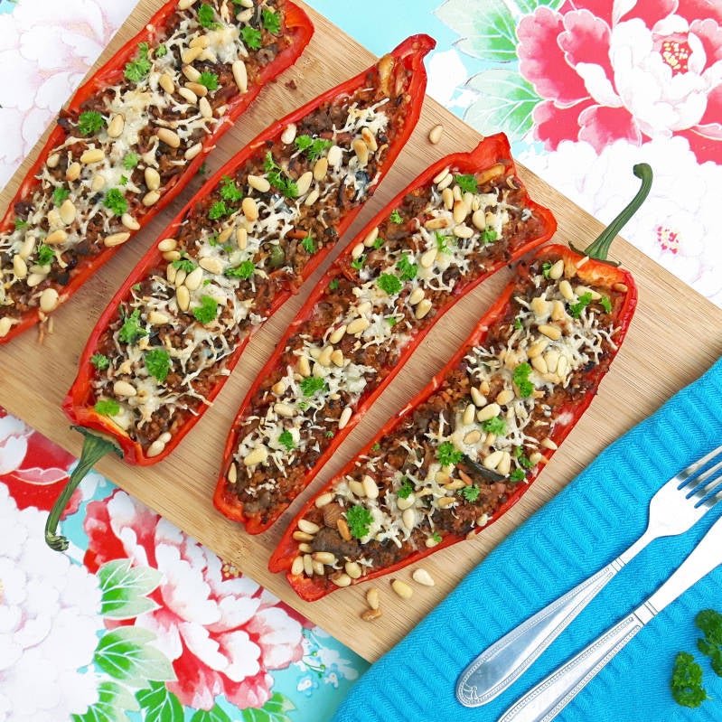 Van alle gevulde groenten is de paprika toch wel onze favoriet. Wij eten door bijna alle gerechten wel paprika trouwens, maar in de gevulde versie zijn wij er helemaal gek op. Dat is nog beter dan gevulde courgettes of aubergines. Portobello's met vulling vind ik trouwens ook heel erg lekker, maar daar ben ik hier thuis de enige in.