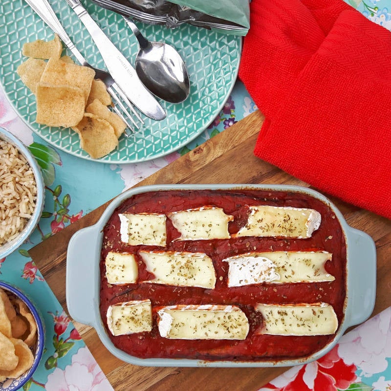 Je ziet het niet, maar onder deze tomatensaus & brie zit geroosterde aubergine. Heel veel! En ook nog kip en rijst. Zo lekker... dit is één van onze favoriete recepten hier thuis!