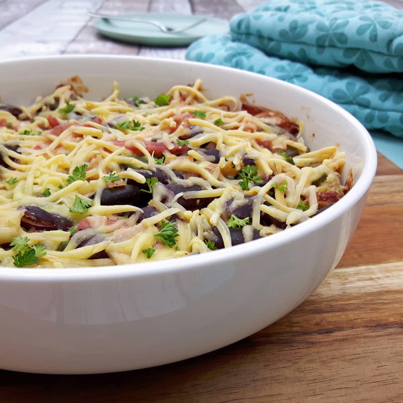 - Doe het bonen-groentemengsel in een ovenschaal en strooi de kaas er over heen.