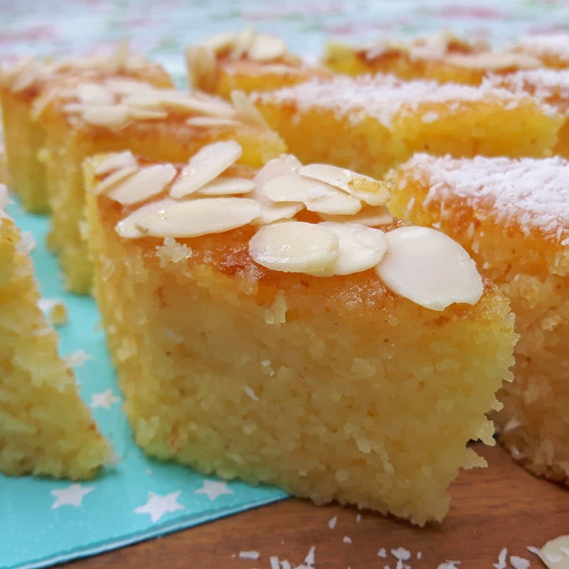 Dat is toch wel een verrassend ingrediënt, vind je ook niet? Maar bakken met vla gaat prima: je krijgt er een heerlijk luchtige, zachte cake mee. In het Marokkaans heet deze griesmeelcake 'revani'. En ze snijden 'm meestal in van die leuke ruitjes. Daar smaken ze niet anders door natuurlijk, maar het staat wel leuk, vind je niet?