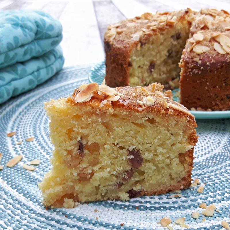 Deze yoghurtcake met rozijnen is zo lekker! Vooral de bovenkant: een lekker knapperig suikerlaagje met amandelschaafsel. Hij is lekker zacht & luchtig, en je hebt er minder boter voor nodig dan voor een gewone cake.