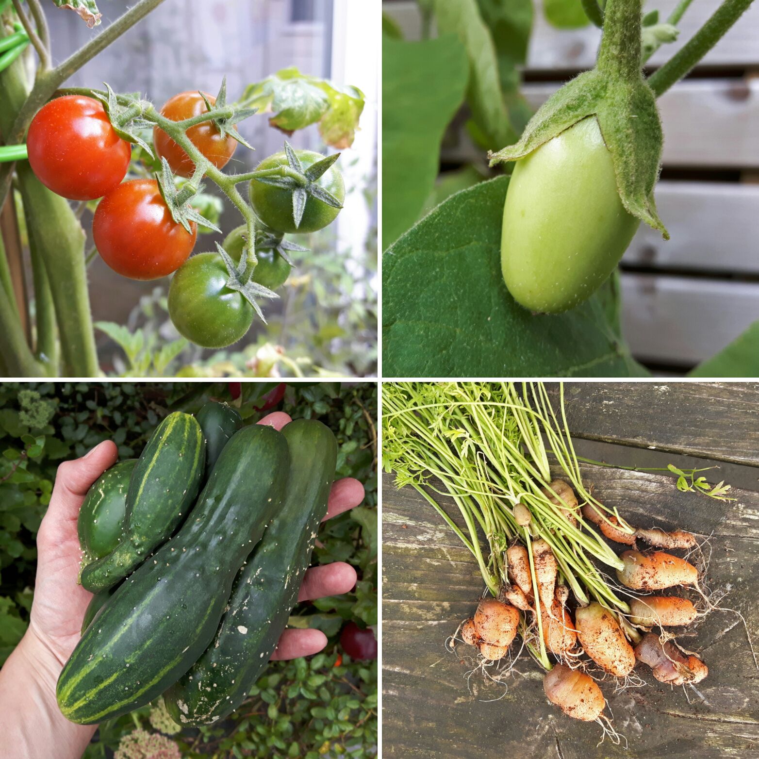 De laatste oogst van deze zomer, denk ik... komkommers, tomaatjes & reuzegrote wortels! En er groeien ein-de-lijk mini aubergines (jullie dachten waarschijnlijk dat 't een eikeltje was, maar nee, dat is een aubergine). Zo leuk! Maar ik ben bang dat die niet meer rijp worden, nu het ineens herfst is geworden. Maar wie weet! Ik blijf nog even hoop houden :-)