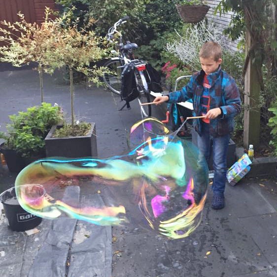 Nog zo'n favorietje hier thuis: zelf gemaakte bellenblaassop. Daarmee kun je niet alleen 'gewone' bellen blazen, maar ook deze reuzegrote!