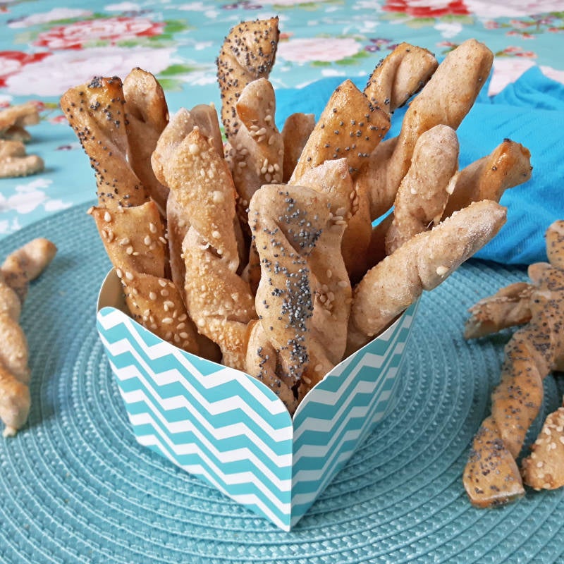 - Draai elke reep tot een wokkel en leg die op een met bakpapier beklede bakplaat. Bestrijk alle 'deegwokkels' met geklutst ei. Bestrooi ze met wat zout en daarna met bijv. maanzaad, sesamzaad of geraspte kaas. Je kunt ze ook 'blanco' laten.