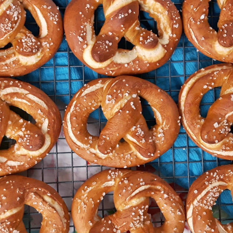 Voordat je deze zachte pretzels bakt, dompel je ze eerst kort onder in kokend water met baking soda. Daardoor krijgen ze die knapperige en goudbruin gekleurde korst. Die kleur komt door de 'maillard reactie': de aminozuren in het hete water met baking soda reageren met de suiker in het deeg. En dan krijg je dit mooie brood!