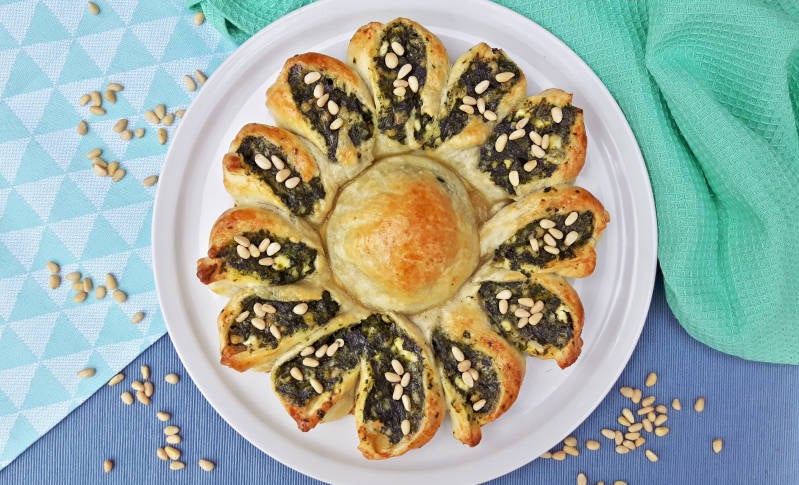 Je kunt natuurlijk allemaal kleine spinazie-feta hapjes maken... maar je kunt er ook een grote bloem van maken! En eigenlijk is dat ook nog sneller gemaakt (ook handig, toch?). Hij is zowel warm als koud heel erg lekker.