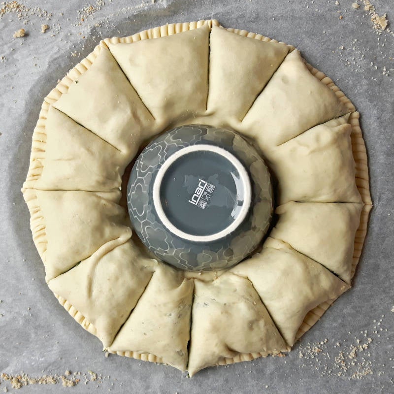 - Snijd daarna het deeg vanaf de buitenrand in 12, 16 of 20 gelijke delen in tot aan het kopje en kantel elk deel daarna voorzichtig een kwartslag. Het kopje voorkomt dat je te ver snijdt of dat het deeg scheurt als je de stukjes kantelt. Haal als je klaar bent de kom er weer af. Bestrijk de bloem met ei.