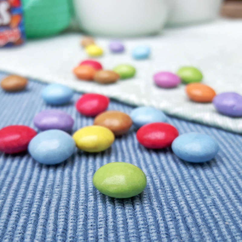- Verdeel de resterende smarties over de vijf schaaltjes en druk ze een beetje aan.