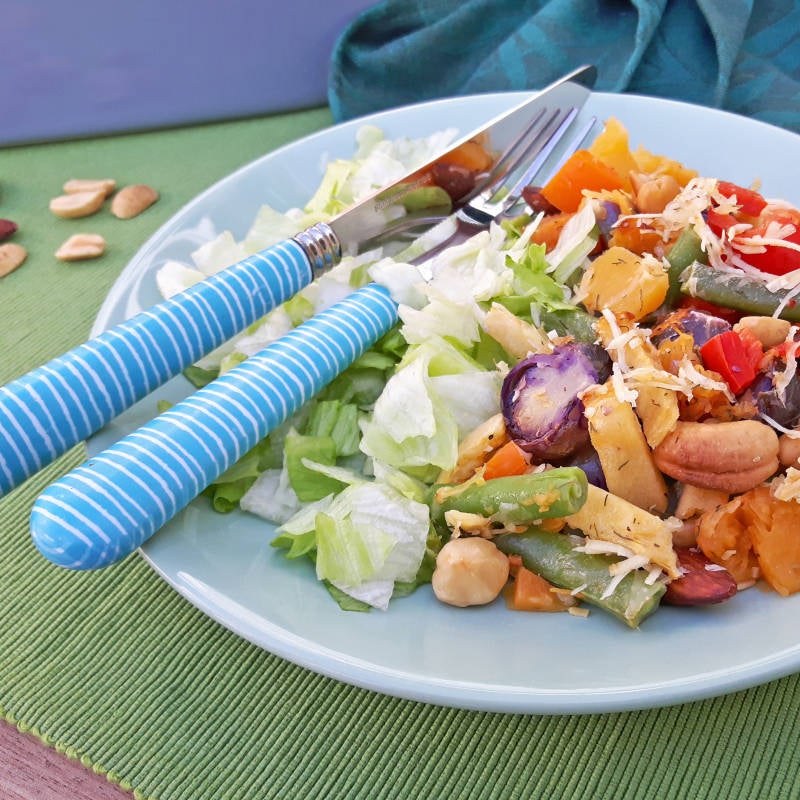 Ik was vooraf helemaal niet van plan om er ook paarse spruitjes doorheen te doen, maar die kwam ik tegen in de vriezer. En ik vond dat de kleur er wel heel mooi bij stond! :-) Je kunt de spruitjes natuurlijk altijd vervangen door een andere groente.