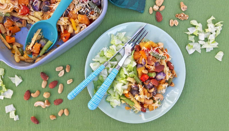 - Hussel alle groenten en noten in een kom samen met de olijfolie, de kruiden en de helft van de geraspte kaas door elkaar. Schep alles in een ovenschaal. Strooi de rest van de kaas er over.