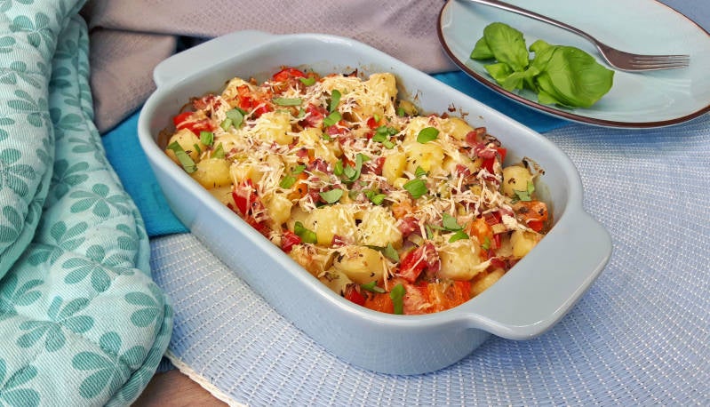 - Meng de aardappeltjes, prei, paprika, spek en kookroom door elkaar. Breng alles op smaak met de knoflook, basilicum, peper en zout. Schep alles in een ovenschaal en strooi er een flinke lading kaas over heen.