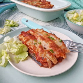 - Stapel verder met de overgebleven plakken courgette en aubergine. Verdeel de rest van de tomatensaus hier over heen.