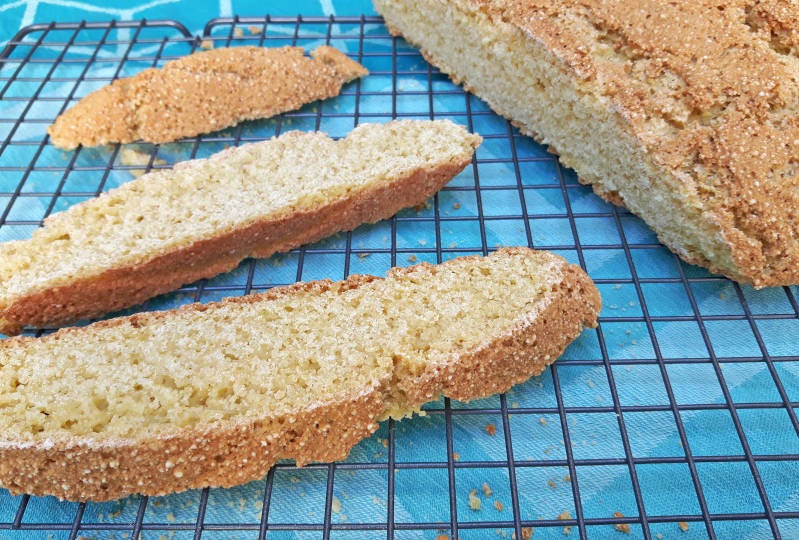 AFGEKEURD! Ik ben aan het experimenteren met gierst & dat gaat lang niet allemaal in één keer goed. "Hé, je hebt een hele grote kokosmakroon gebakken," riep Jan Albert zodra hij dit gierstbrood zag. :-) Daar had 'ie wel een punt mee, want de structuur van dit 'brood' lijkt ook meer op een knapperige koek dan op een zacht brood. Geen succes dus.