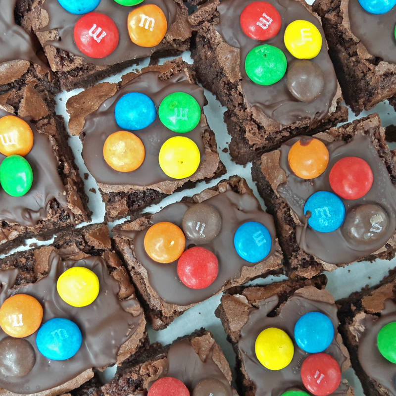 - Smelt 100 gram pure chocolade au bain marie. Giet de gesmolten chocolade over de twee brownievormen en strooi de M&M's er over heen. Laat de chocolade daarna uitharden.