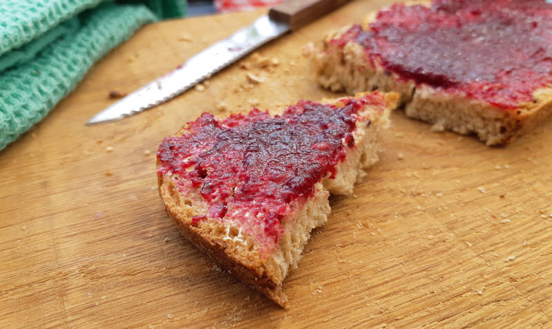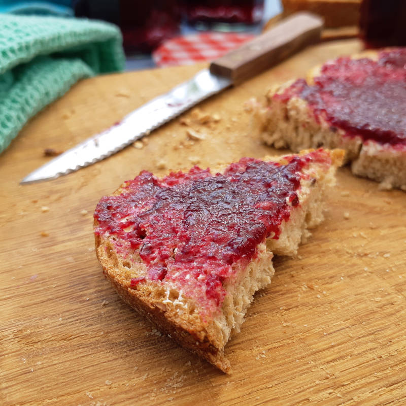 - Doe de gezeefde fruitmassa weer in de pan, roer de suiker er door heen en breng alles weer aan de kook. Laat zachtjes doorkoken tot de jam de gewenste dikte heeft. Dat laatste is lastig inschatten, want na een uur zachtjes borrelen vond ik de jam nog steeds heel dun. Ik heb 'm toch maar in de potjes gedaan, en na afkoelen was de jam toch dik geworden!