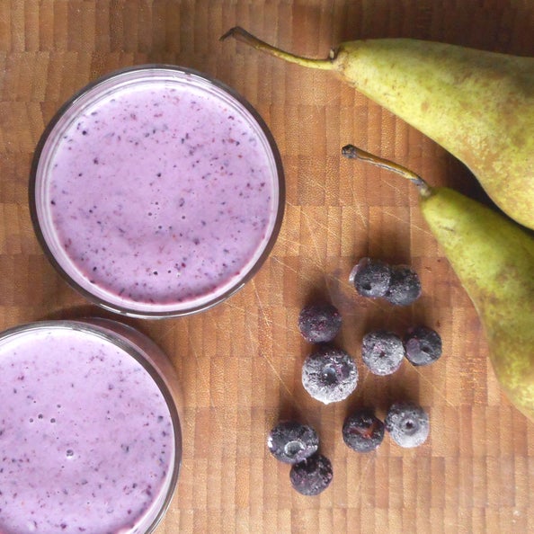 Lekker voor op een warme zomerdag: een gezonde smoothie met peer & bosbessen!