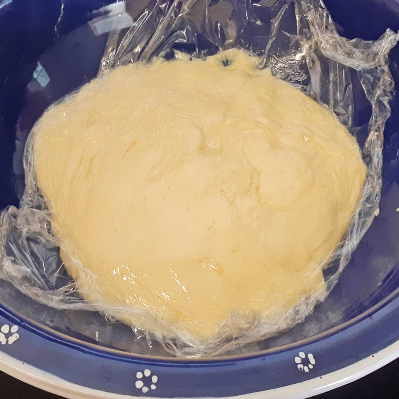 - Giet de warme room in een schaal en bedek de room met huishoudfolie. Dat leg je óp de room (dus niet over de rand van de schaal spannen). De folie voorkomt dat er een vel op de room komt!