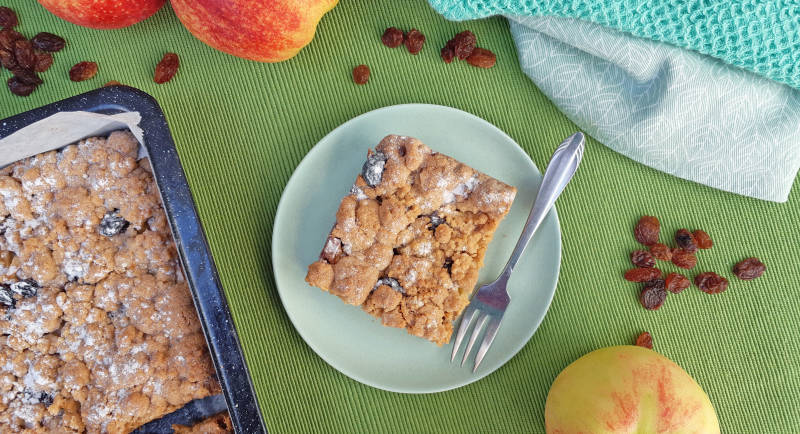 - Strooi de stukjes appel en de rozijnen over de spijs. Verkruimel de rest van het deeg hier weer over heen.