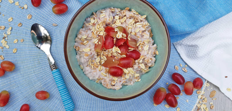 - Meng alle ingrediënten door elkaar, op het extra handje muesli en de extra druiven.