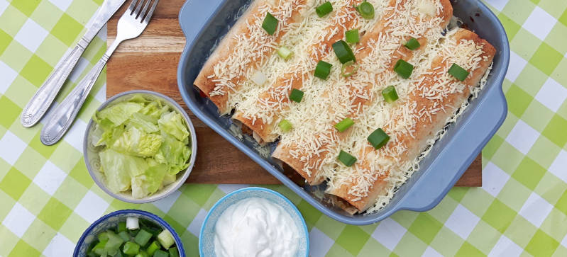 - Schuif de ovenschaal in de oven en bak de wraps 20-25 minuten, totdat alles goed warm is en de kaas mooi goudbruin.