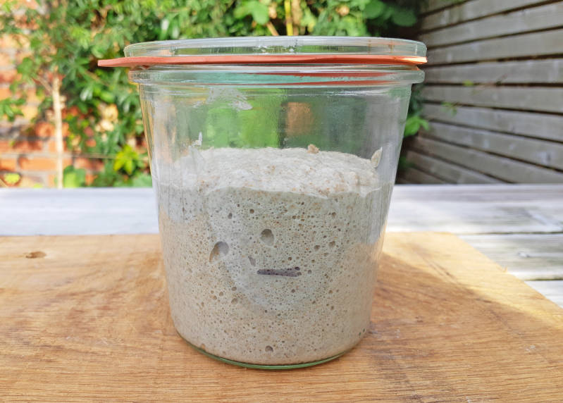 Ik bewaarde 'm nog wel in de koelkast, dan houdt 'ie het wat langer vol. Maar ja, ook dan moet je 'm regelmatig 'voeden' met meel en water. En dat had ik dus eventjes niet gedaan. Vrijdagavond ben ik dus maar begonnen met een nieuwe starter, en nu - na twee dagen - is 'ie binnen 12 uur al verdubbeld! Dat gaat toch best goed, hè? Nog een paar daagjes en dan heb ik weer een goede sterke starter waar ik brood mee kan bakken. :-)