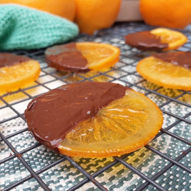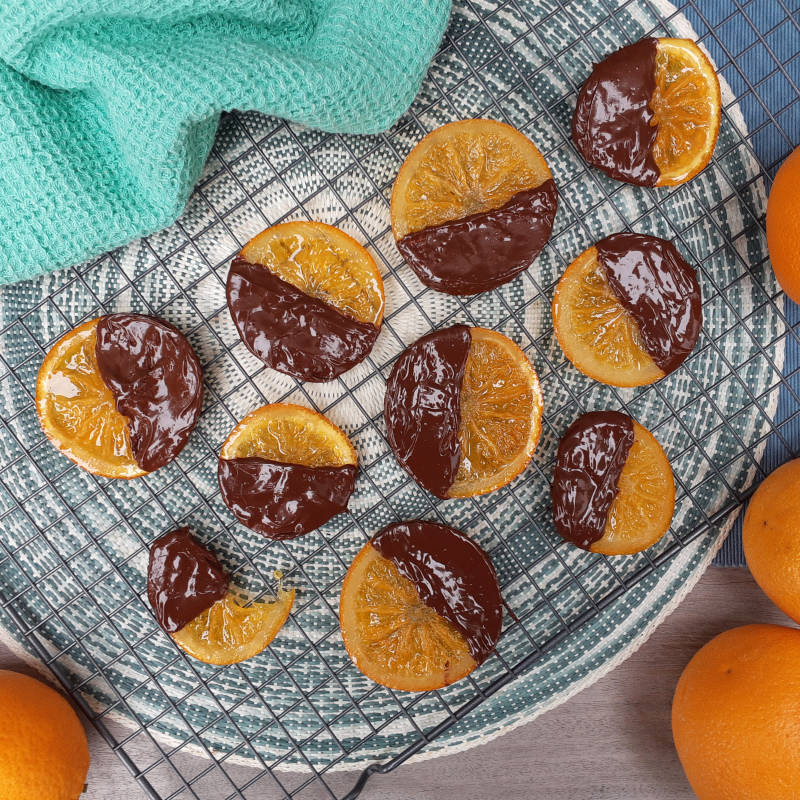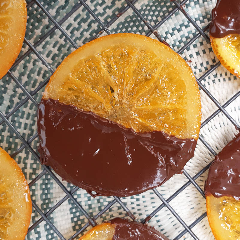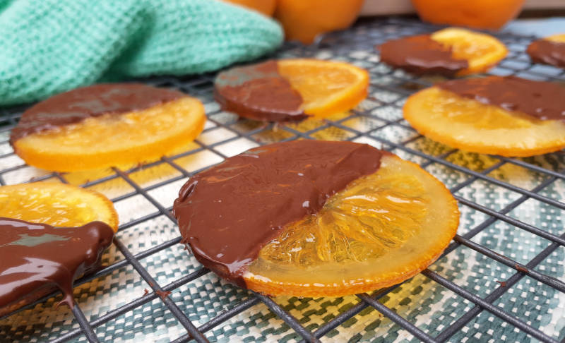 - Smelt de chocolade au-bain-marie. Doop de sinaasappelschillen voor de helft in de chocolade. Leg ze daarna weer op het rooster en laat de chocolade uitharden.