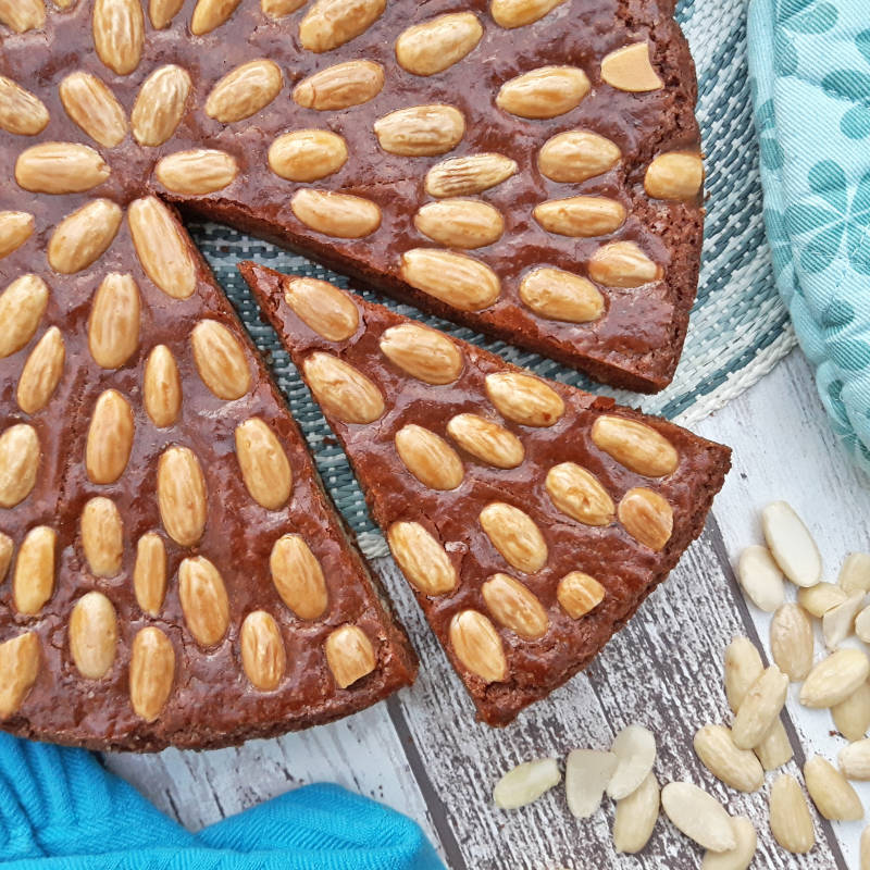 - Druk de amandelen in een mooi patroon in de bovenkant van taart (leef je uit!).