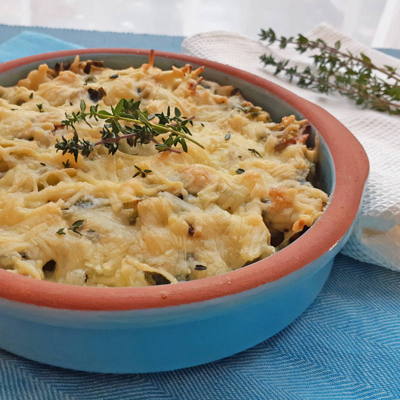 Eigenlijk kun je deze schotel ook al eten zonder dat 'ie in de oven is geweest, maar dan krijg je niet die goudbruine laag kaas er op. En die is nou juist zo lekker, hè? :-)