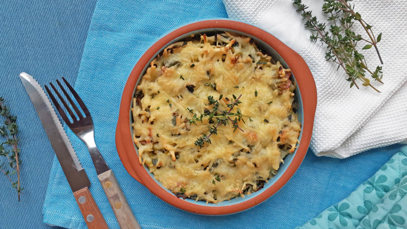 Je hebt 'm heel snel gemaakt er zitten lekker veel groenten in, in deze pastaschotel met ham, kaas, prei en tijm.