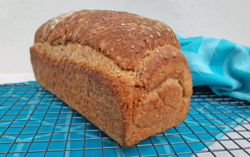 - Het brood is klaar als het hol klinkt als je op de onderkant klopt of als de kern- temperatuur 95 graden is. Haal het brood uit het bakblik en laat afkoelen op een rooster.