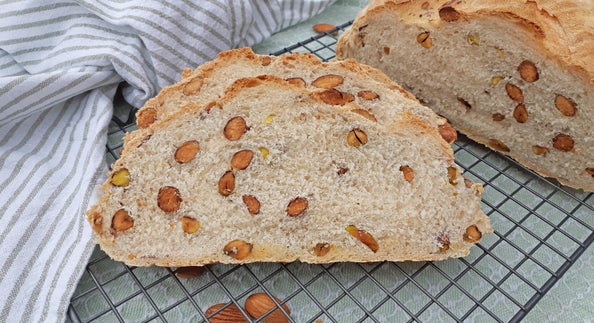 Dit brood was zo lekker dat ik 'm bijna helemaal in mijn eentje heb opgegeten! :-) Door de noten die er in zitten is het brood ook zonder beleg al heerlijk.