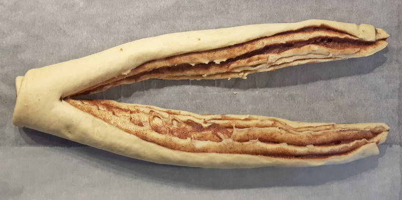 - Draai de beide helften deeg in elkaar, met de opengesneden kant naar boven. Druk de beide uiteinden in elkaar en vouw die onder het brood. Snijd daarna ook de kant die nog aan elkaar vast zit door, druk dit in elkaar en vouw de zijkant daarna onder het brood. Als je brood lang genoeg is, kun je 'm ook in de vorm van een pretzel draaien of er een rond brood van maken. Mijn stuk deeg was daarvoor te kort, dus ik liet 'm gewoon zoals 'ie was (een lang brood dus).