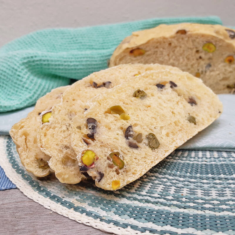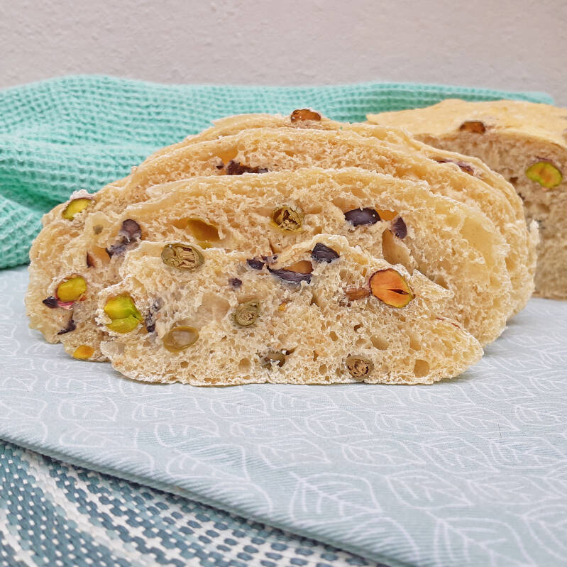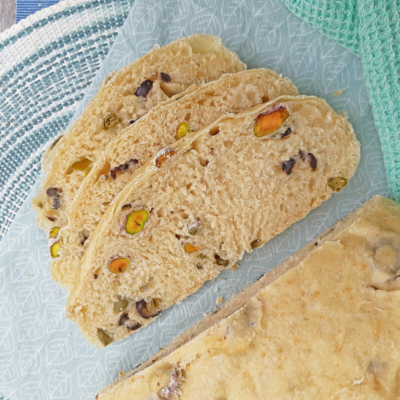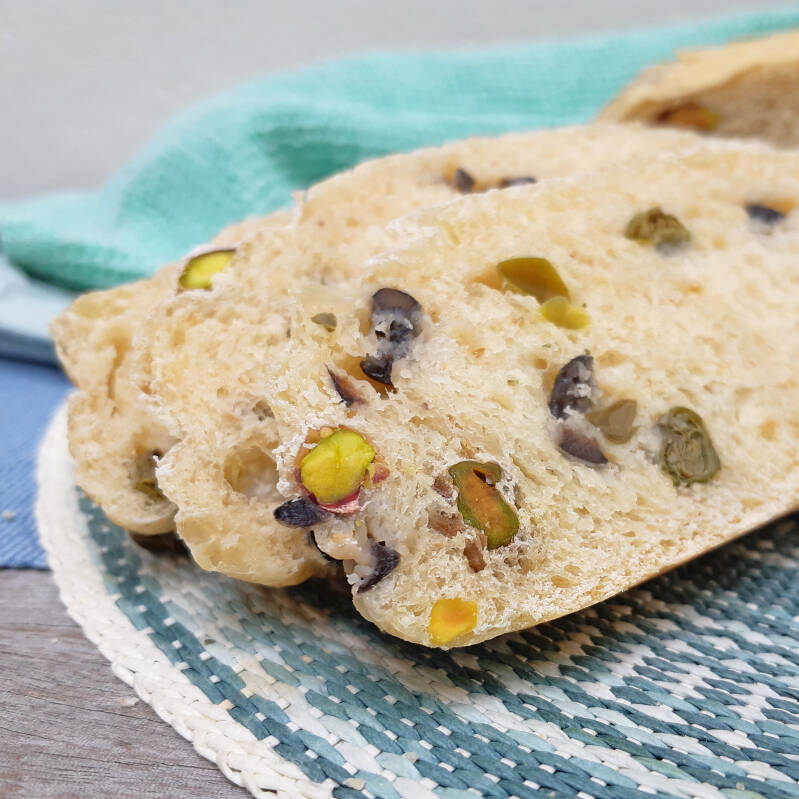 Dit is zo'n lekker broodje: heerlijk zacht en met veel smaak door de olijven, kappertjes en pistachenootjes die er door heen zitten. En het mooiste is dat je het deeg niet eens hoeft te kneden. Je moet er alleen even de tijd voor nemen, want het deeg staat lang te rijzen.