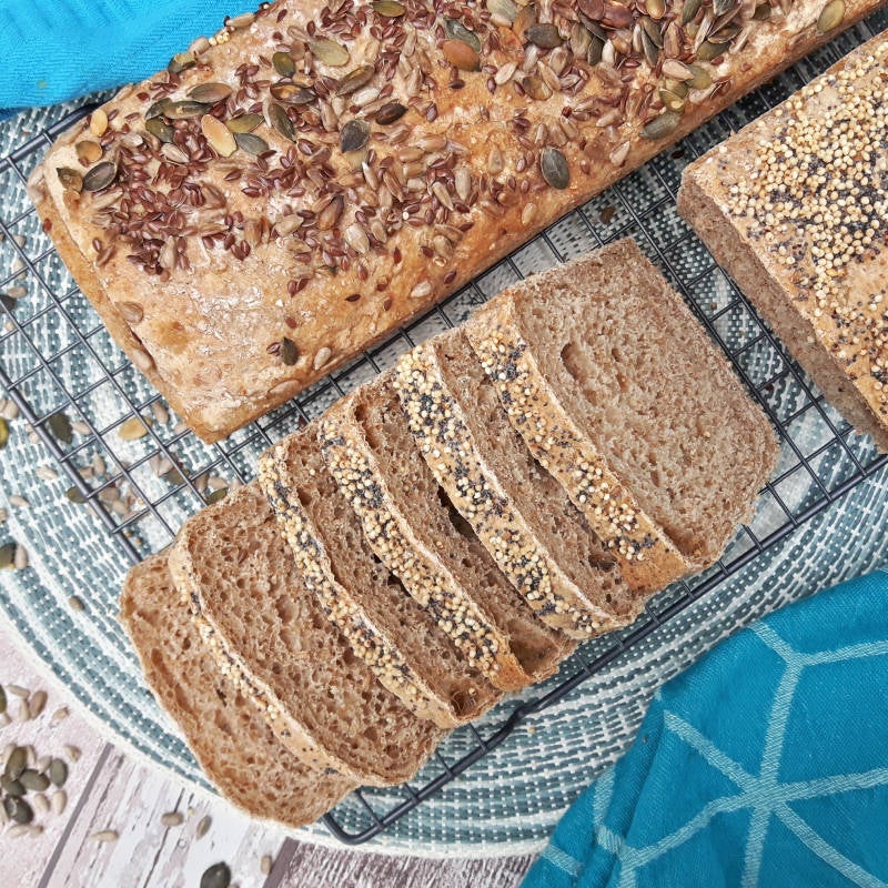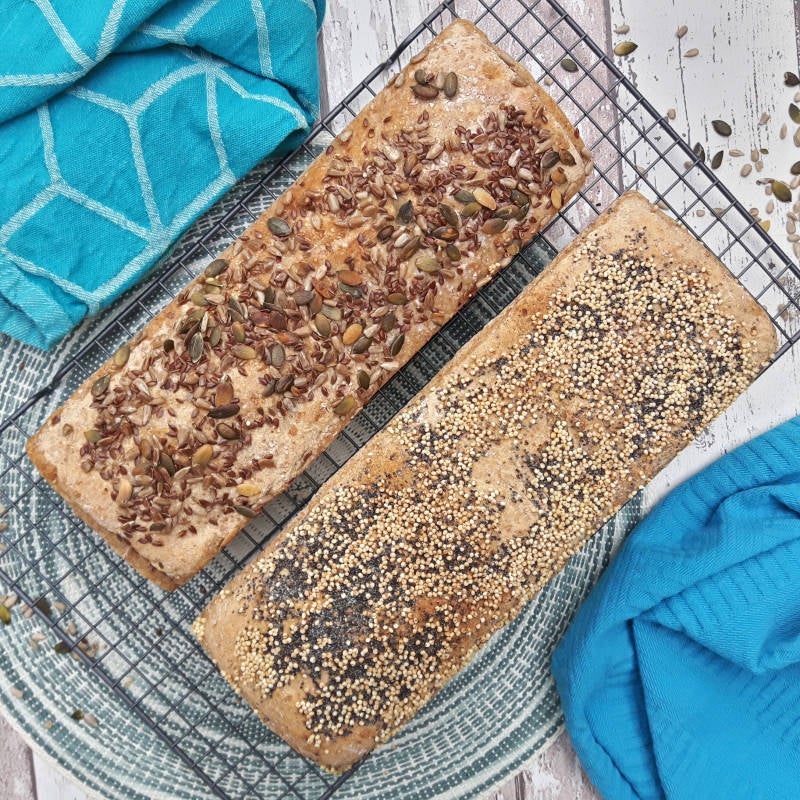 - Als je zaden wilt toevoegen, maak dan met je handen de deegrol nat met wat water, strooi de zaden op een schoon werkblad en rol de deegrol er door heen.