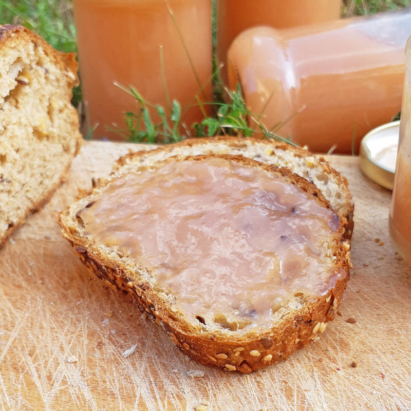 In één abrikoos zat trouwens ook nog een rups. Die heb ik maar niet mee gekookt in de pan... Leek me toch minder lekker, haha! :-) Ik maakte de jam met wat bananensap er door (dat kocht ik gewoon in een pak, net zoals appelsap). Maar je kunt ook gewoon sinaasappelsap of iets dergelijks gebruiken. Dat geeft natuurlijk wel net weer een wat andere smaak.
