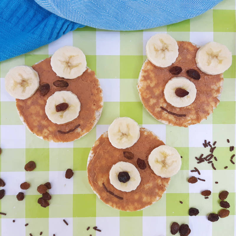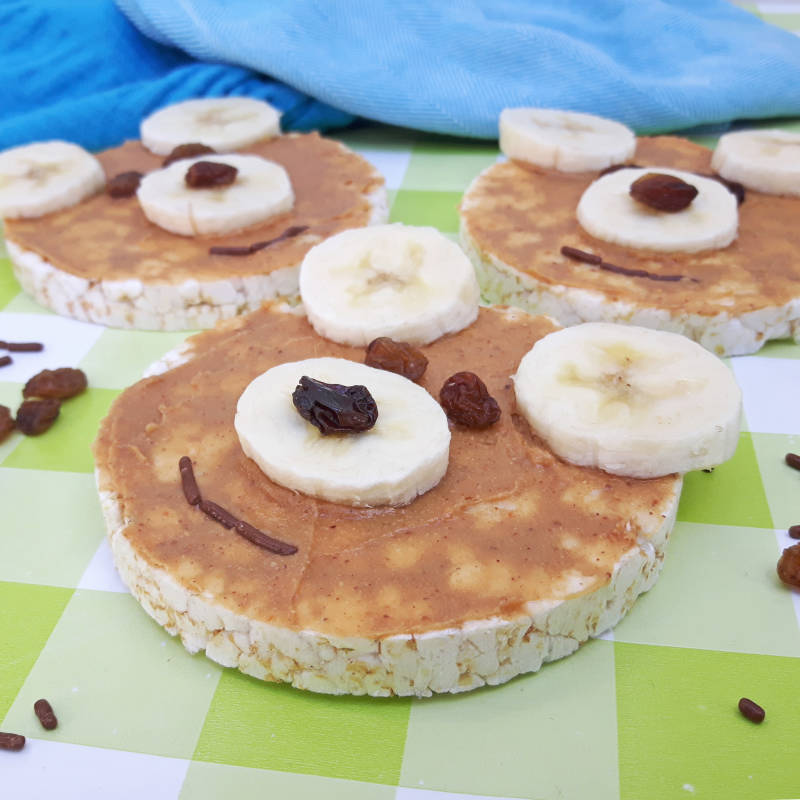 - Leg in het midden van elke rijstwafel één schijfje banaan als neus, en twee bovenaan als oren.