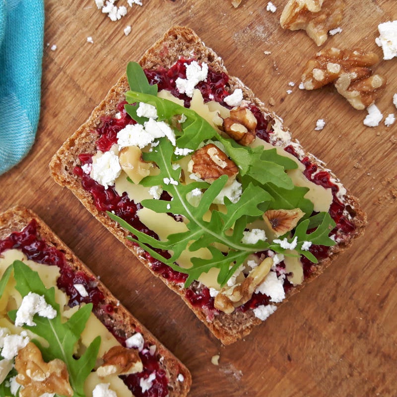 Ik had nog allemaal restjes in de koelkast liggen: een beetje zelfgemaakte jam, een paar plakjes komijnekaas, een restje feta, wat walnoten en een handje rucola. Samen werden dat deze twee lekkere broodjes. Restjes moet je gewoon nooit weggooien, je kunt er altijd nog een lekkere lunch mee maken!