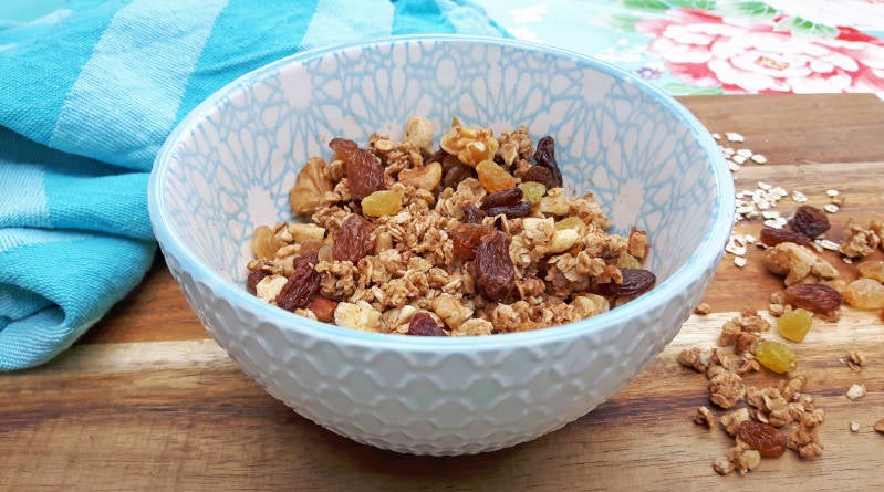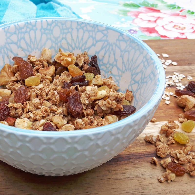 - Laat de granola afkoelen en meng daarna de rozijnen er door heen.