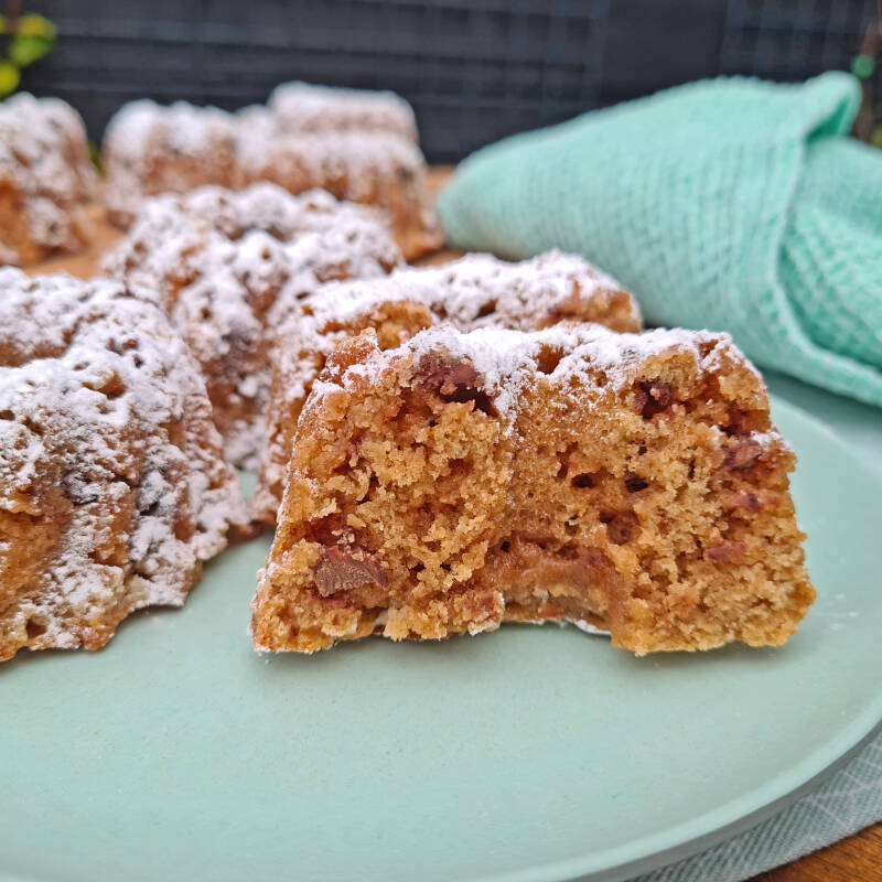 Een gewone tulbandcake is alleen zo groot (al is dat met de jongens hier thuis meestal niet zo'n probleem, de cake komt toch wel op). Met van die kleine tulbandvormpjes bak je gewoon net zoveel eenpersoonscakejes als je nodig hebt. Ik deed ook wat greinsuiker door de cakejes. Dat geeft er, samen met de kaneel, een beetje een suikerbrood-smaak aan. Lekker!