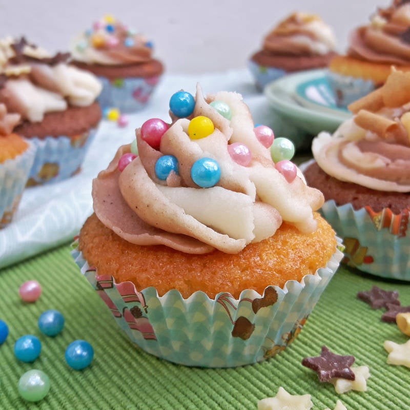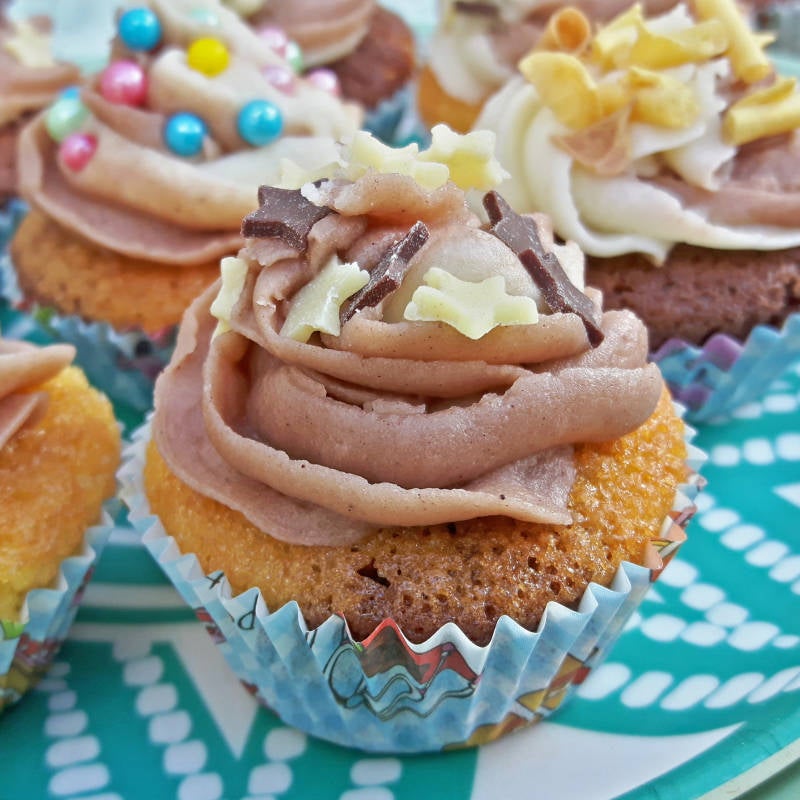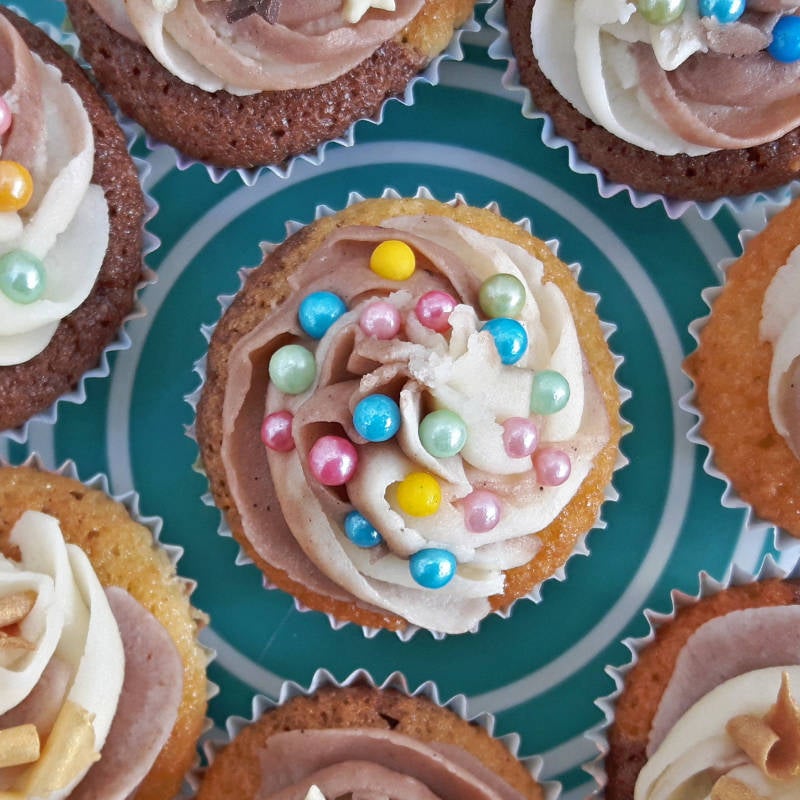 - Spuit op elke cupcake een mooie toef. Versier de cupcakes daarna met bij. spikkels, chocolade of suikersnoepjes.