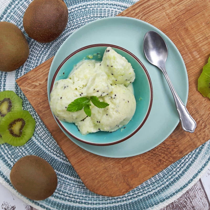 Kiwi-ijs! Ik vind kiwi's wel lekker, maar eet ze bijna nooit. Ik krijg er vaak zo'n metalige smaak van in mijn mond. Hebben jullie dat ook wel eens? Dus maakte ik maar ijs van een paar kiwi's, dan heb ik daar geen last van! :-)